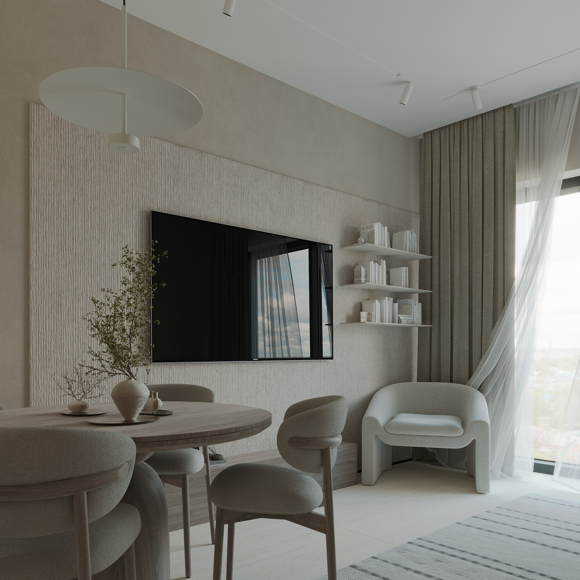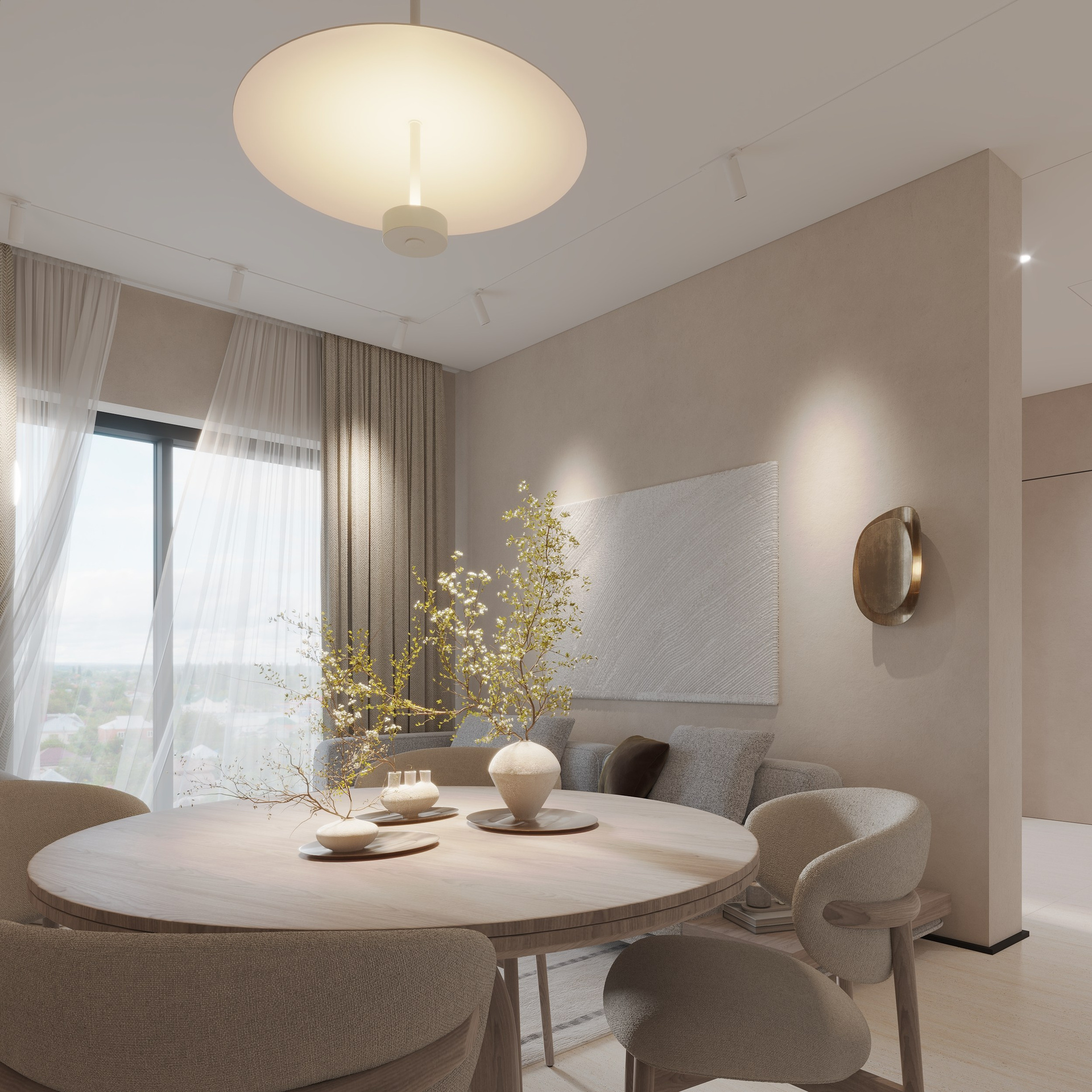 Современный интерьер, наполненный мягким светом, природными материалами и спокойной цветовой палитрой.