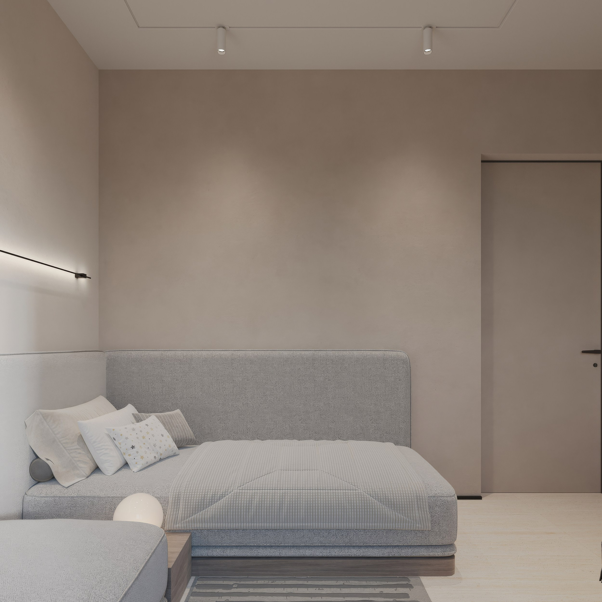 Каждое помещение — гостиная, спальня, детская и ванная — имеет собственную атмосферу, но все объединены единой эстетикой спокойствия и эстетического баланса.